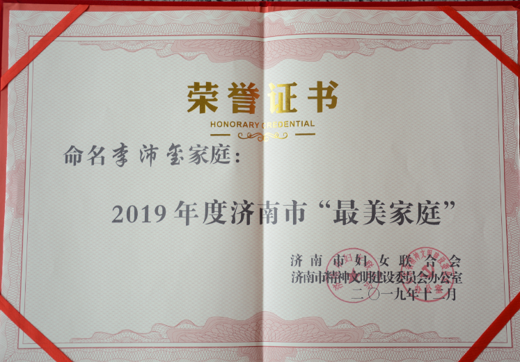 为深入贯彻落实习近平总书记“注重家庭、注重家教、注重家风”的重要指示精神,推动社会主义核心价值观在每一个家庭落细落小落实,发挥家庭在弘扬中华民族传统美德,传承良好家风方面的重要作用,自2019年3月起,济南市妇女联合会、济南市文明办在全市开展了寻找“最美家庭”活动。经逐级推荐、审核、评选、公示,章丘区民政局推荐的李沛玺家庭被命名为“2019年度济南市最美家庭”。